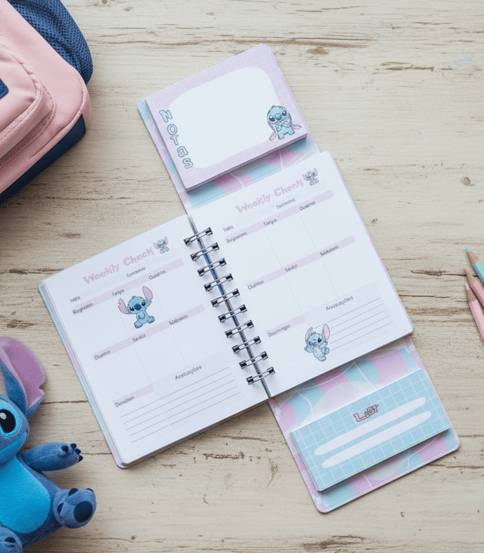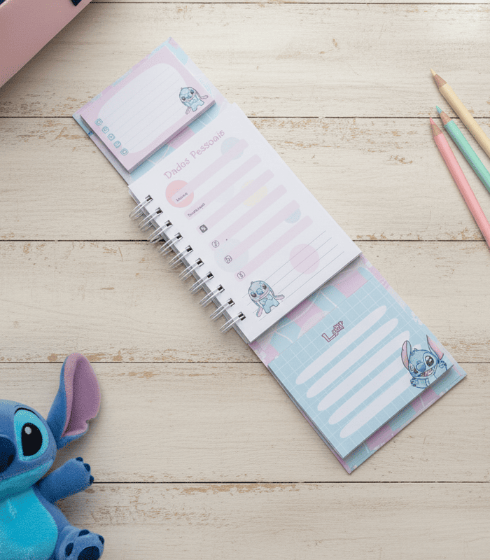 Olha só esse planner com dois bloquinhos e um fechamento de encaixe super criativo inspirado no nosso querido Stitch!