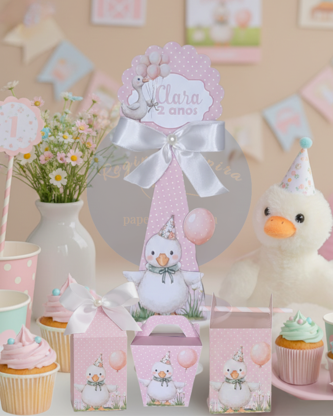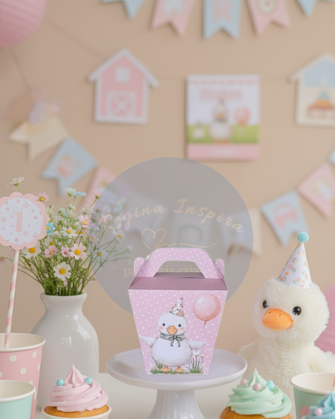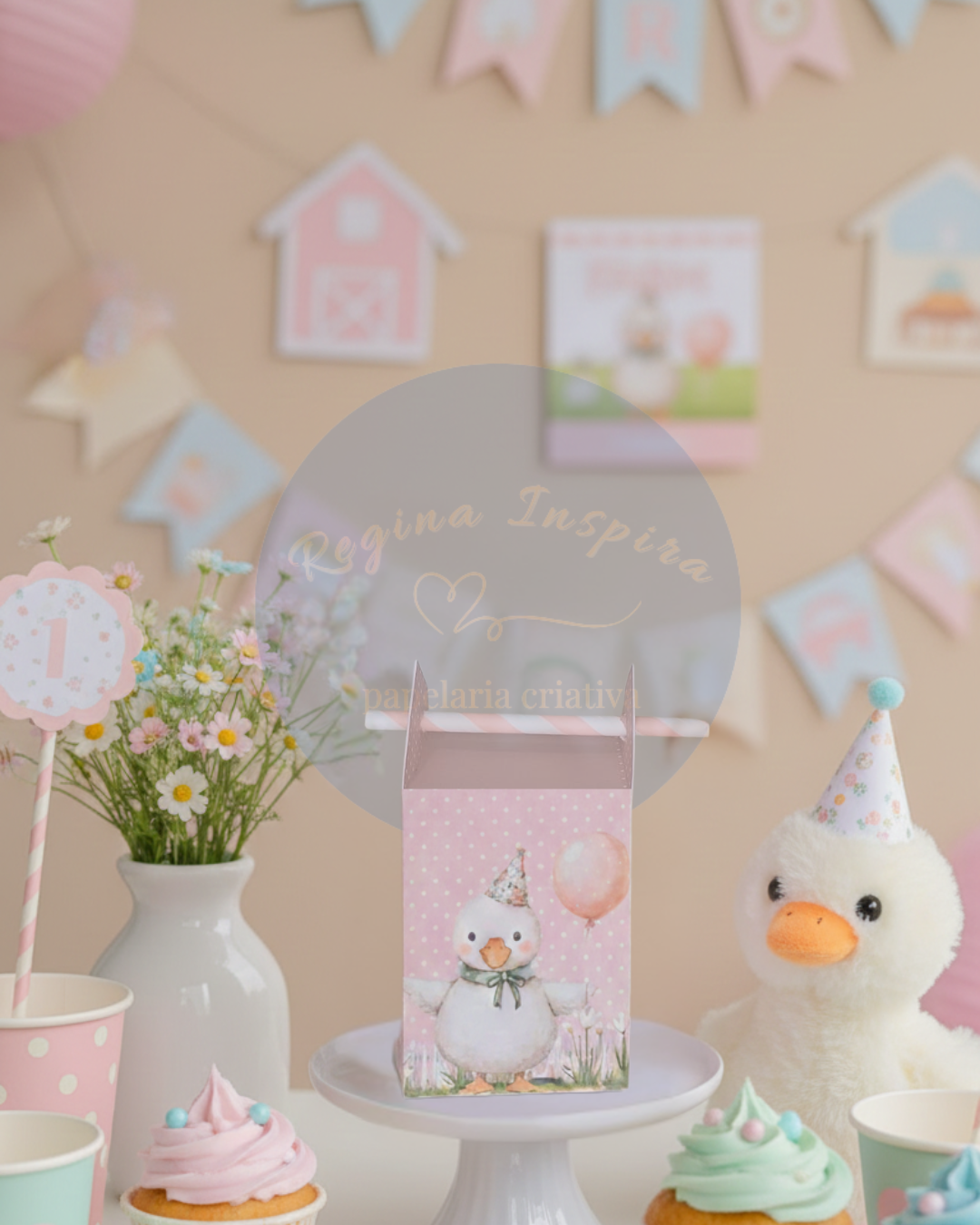 Inspirado no universo campestre e no charme suave do estilo country infantil, o kit traz uma paleta de tons rosados e pastel, com ilustrações encantadoras da patinha festeira, laços delicados e acabamento que transborda carinho em cada detalhe.
