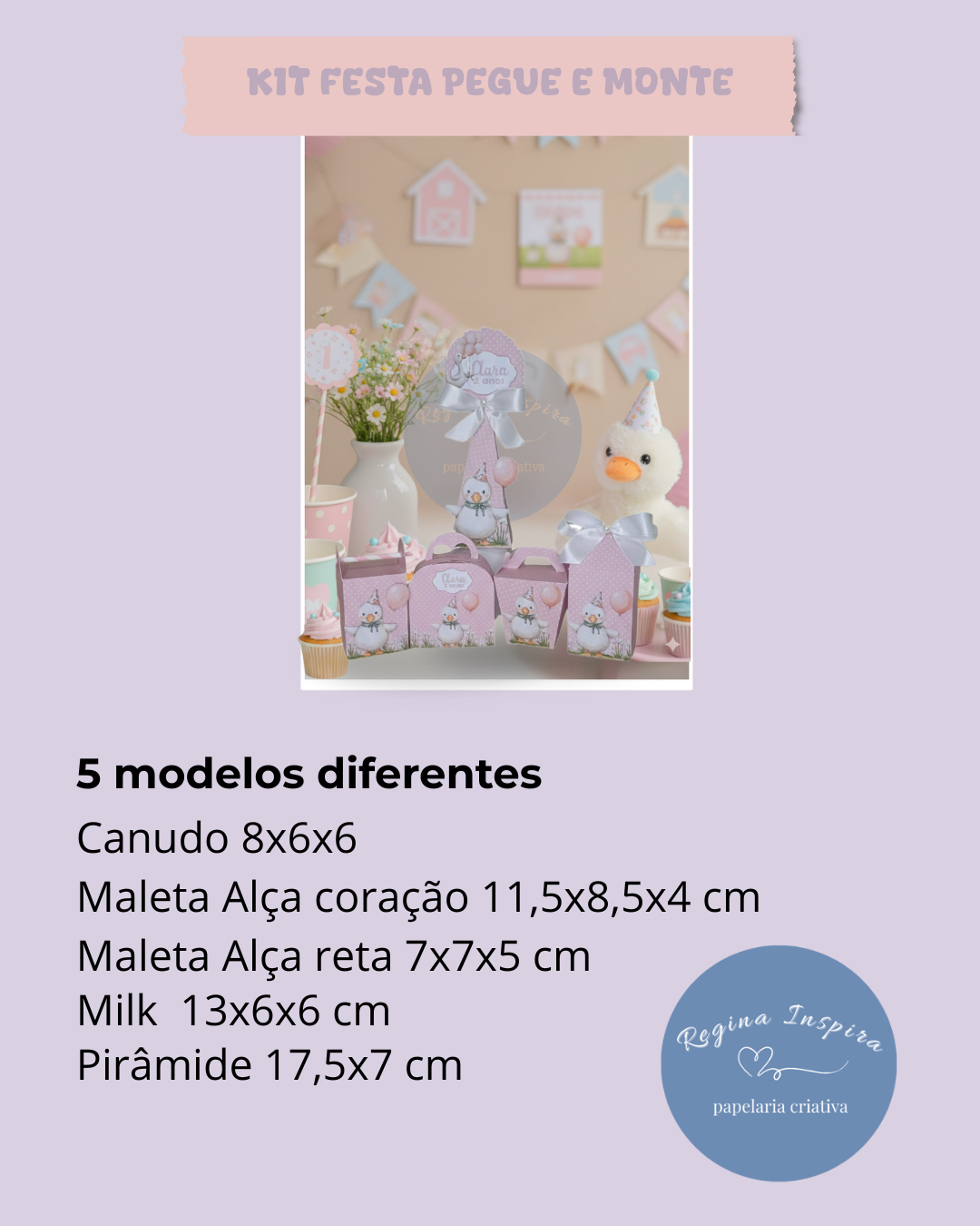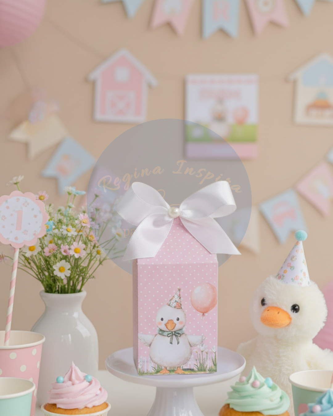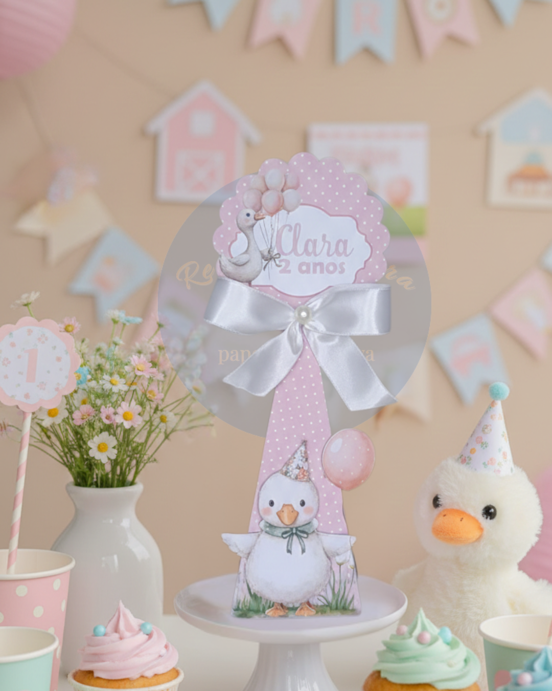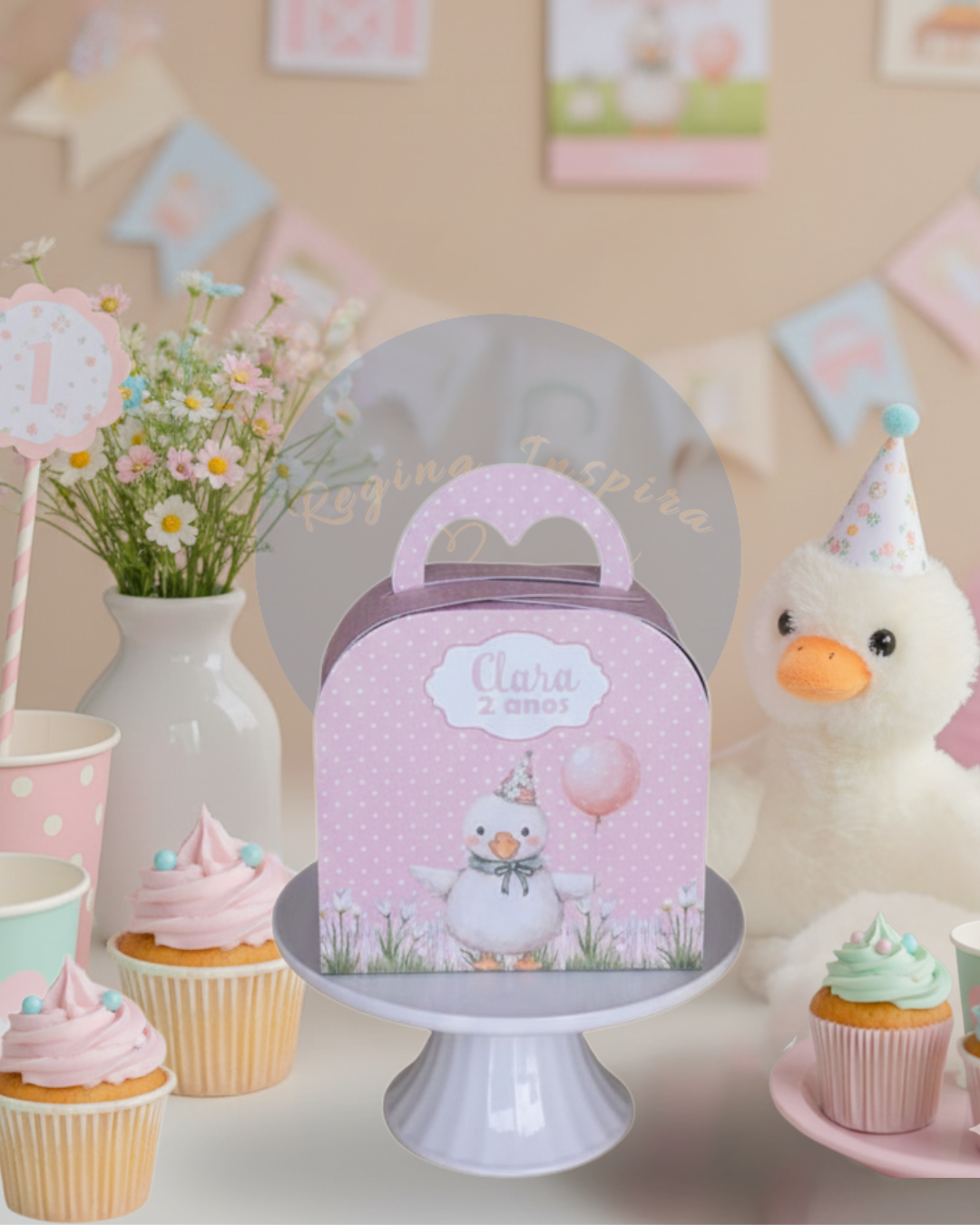 Inspirado no universo campestre e no charme suave do estilo country infantil, o kit traz uma paleta de tons rosados e pastel, com ilustrações encantadoras da patinha festeira, laços delicados e acabamento que transborda carinho em cada detalhe.