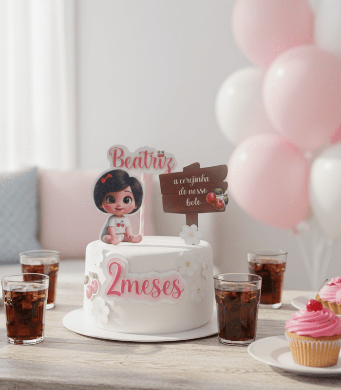 Delicadamente ilustrado, o topo de bolo é o destaque da mesa! Com acabamento impecável, ele traz o charme das cerejinhas em tons vibrantes, dando o toque final de alegria à decoração.